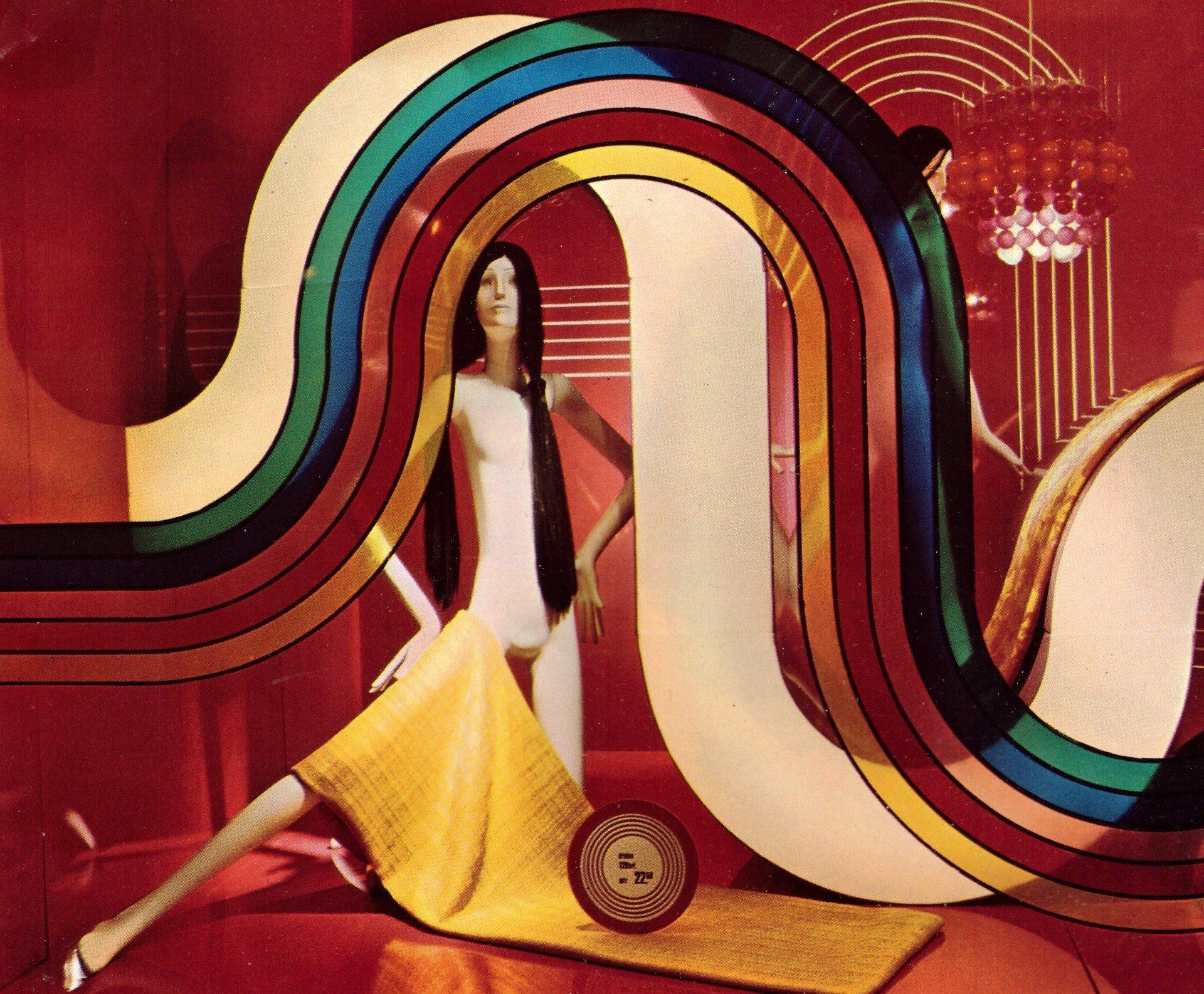 In shapes and colours, this shop window exemplifies the fashionable current of the early 1970s. The design of the Visiona exhibitions was the godfather for the colour and shape design of this window. The colourful adhesive of the glass pane is also modelled on the textile design Mira-Spectrum designed by Verner Panton. The mannequin (fa. Schläppi 'Loisir') is, however, a discontinued model, since the androgynous child woman no longer corresponded to the zeitgeist.