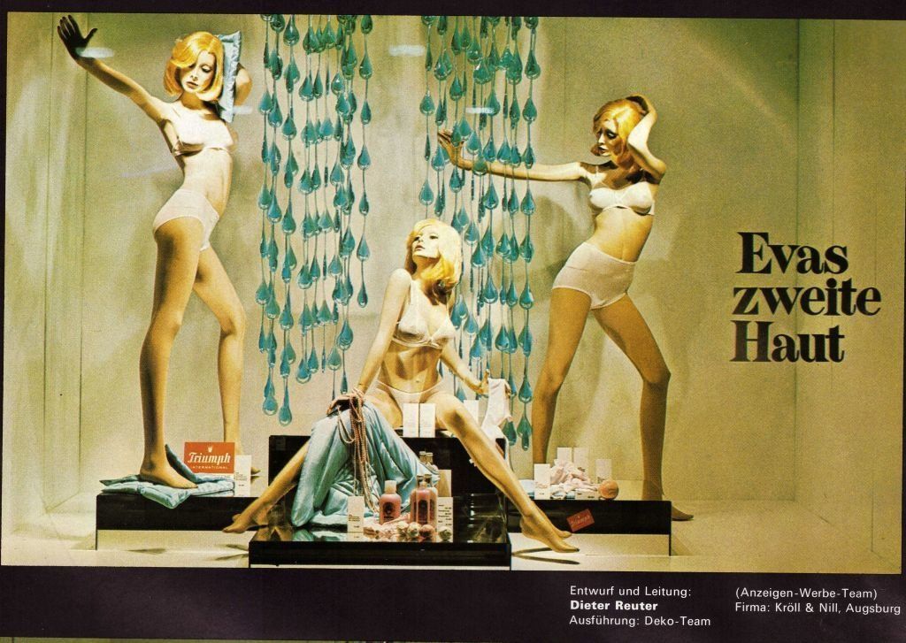 1976: Drei weibliche Schaufensterfiguren gleicher Serie, verschieden hohe Podeste und als Blickfang zwei Vorhänge aus Kunststoff-Wassertropfen bilden die Grundlage dieser Schaufenstergestaltung. Unter dem Motto »Evas zweite Haut« offerierte das Kaufhaus Kröll & Nill in Augsburg Miederwaren für eine bestimmte Zielgruppe von Frauen, die sich entsprechend ihrer Zielgruppe positionieren. Was wehren die Figuren mit ihren Armgesten ab...?