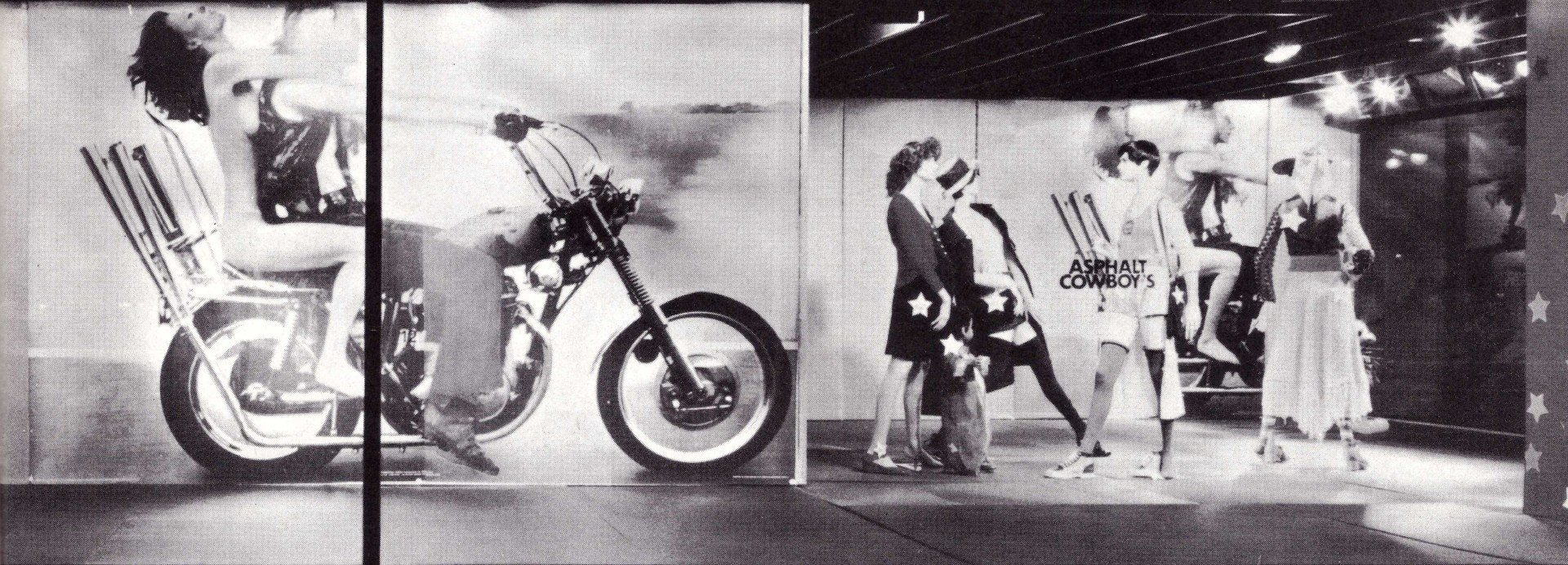 1971: This shop window is an example of a series of windows created by the department store Karstadt am Nordbad in Munich, in cooperation with a car dealership. This showcase shows women's fashion on a group of female mannequins standing together at irregular intervals. What is interesting here, however, is the design of the rear wall, which offers the only eye-catcher. The photo wallpaper of a motorcycle converted into a chopper shows oversized. The motorcycle was photographed while driving and is being driven by a man in rocker clothes. On the sun sits a completely unclothed woman and clings to the driver. She put her arms around his neck and threw her head backwards, causing her hair to fall backwards. Her eyes are devotedly closed. In this way, she demonstrates her dependence on the rider of the motorcycle. He dressed, she naked. Motorcycling stands for freedom... for whose freedom?