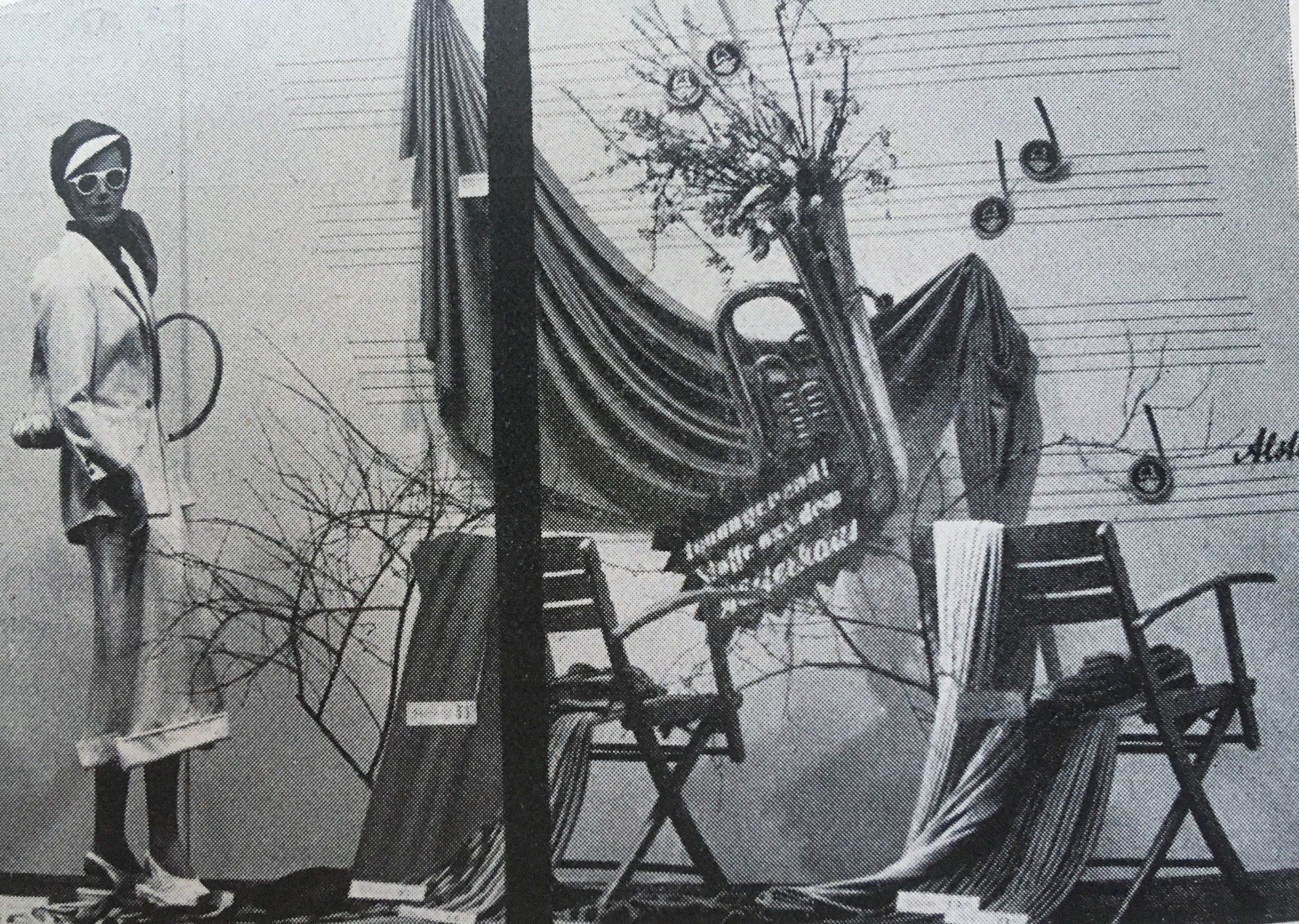 Der Schaufenstergestalter dieses Stoff-Schaufensters nutzte die Anatomie der Scheren, um sie mit der Drapage Frauenkörpern anzugleichen. Auffallend ist bereits hier die Fixierung des Stoffes zu einer extrem dünnen Taille, um einen Frauenkörper zu simulieren, bzw. die Vorstellung davon.