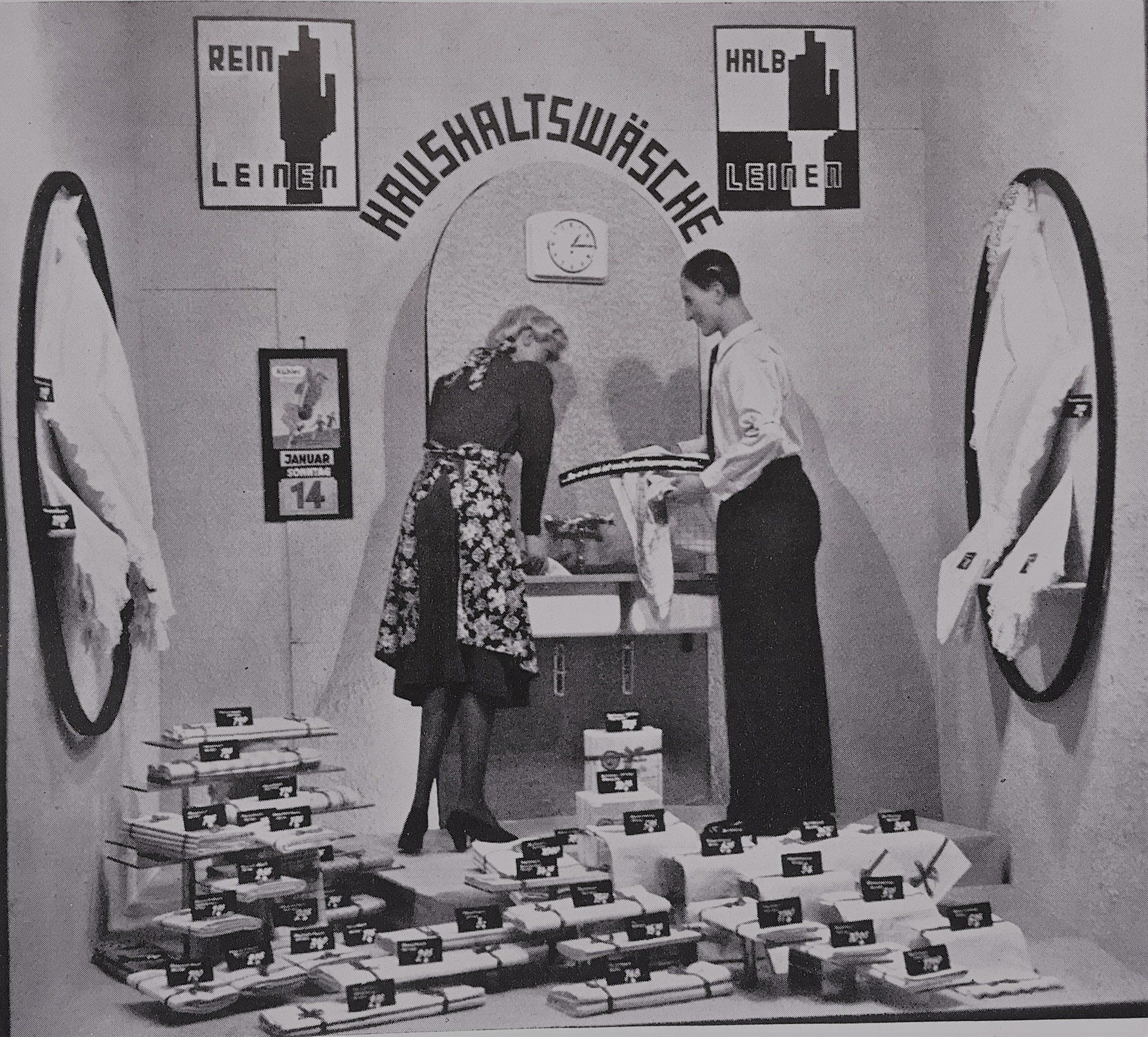 Eine Frau, die in ihrem großzügigen Hochbeet liegt, träumt von weißem Leinen und dieser Traum wird im Kaufhaus Althoff erfüllt. In diesem Fall zeigt die Phantasie der Schaufensterdekoration wieder ein Klischee, nämlich das der Hausfrau, die nur dann glücklich lebt, wenn die Wäsche weiß und der Haushalt sauber ist. Dieser Berg der Wäsche war jedoch für die meisten Hausfrauen in dieser benachteiligten Zeit ein Albtraum, da sich nur sehr wenige Haushalte eine Waschmaschine leisten konnten.