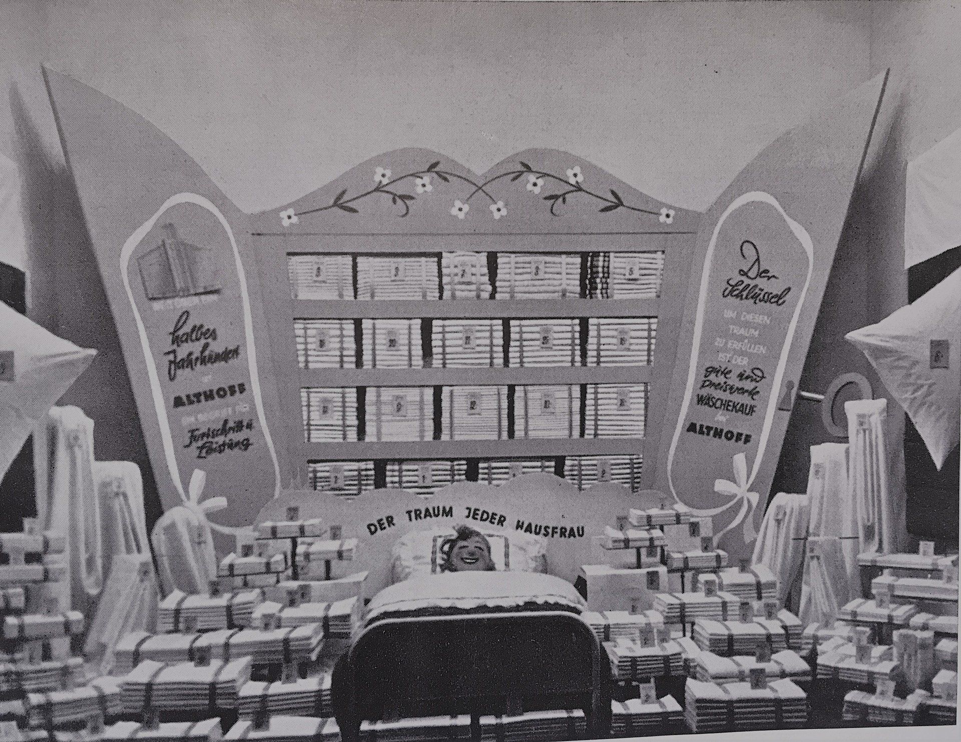 A woman lying in her generously raised bed, dreams of white linen and this dream is fulfilled in the Althoff department store. In this case, the window dresser's imagination again shows a cliché, namely that of the housewife, who only lives happily when the laundry is white and the household is clean. However, this mountain of laundry was a nightmare for most housewives in this deprived time, since very few households could afford a washing machine.